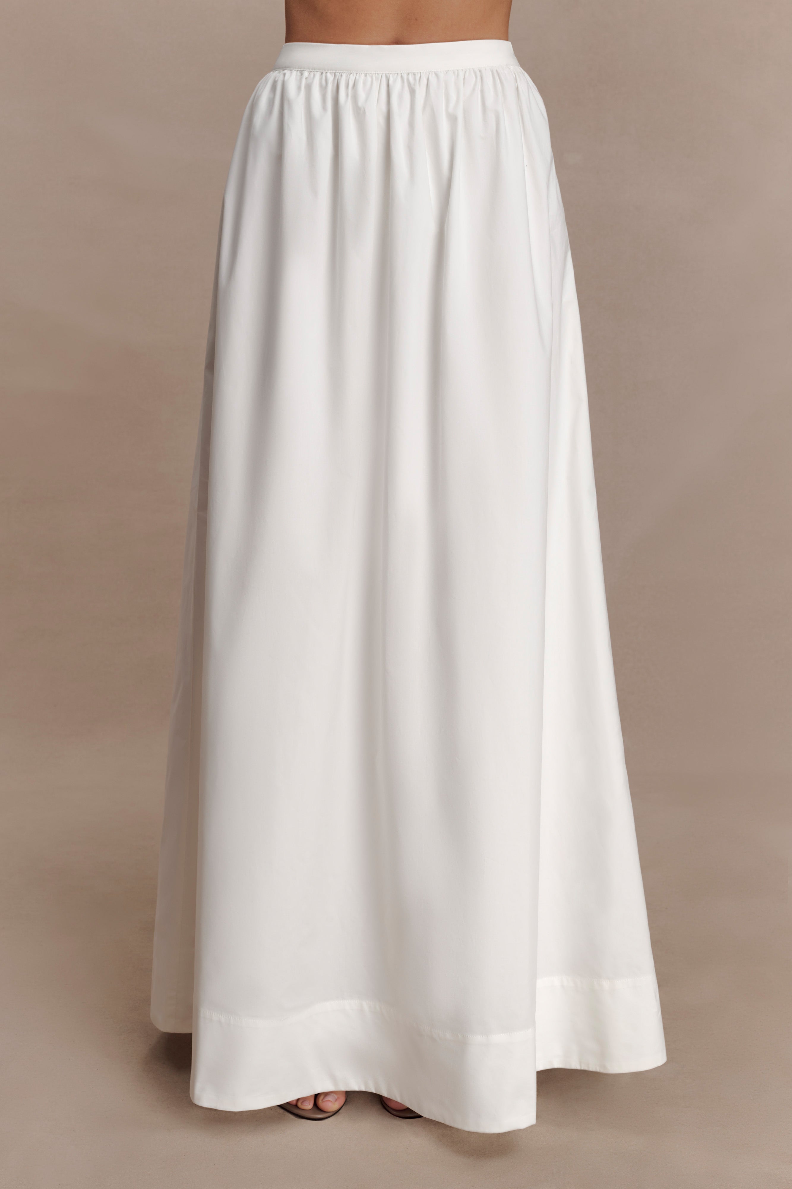 The RIVER Gathered Maxi Skirt is designed to move with understated elegance. Featuring a narrow waistband and soft gathering through the skirt. it creates fluid volume while maintaining a clean. elongated silhouette. Fully lined for comfort and coverage. this maxi-length style falls effortlessly with natural movement. Refined and versatile. this skirt is made for moments that unfold with ease — composed. modern. and quietly elevated.